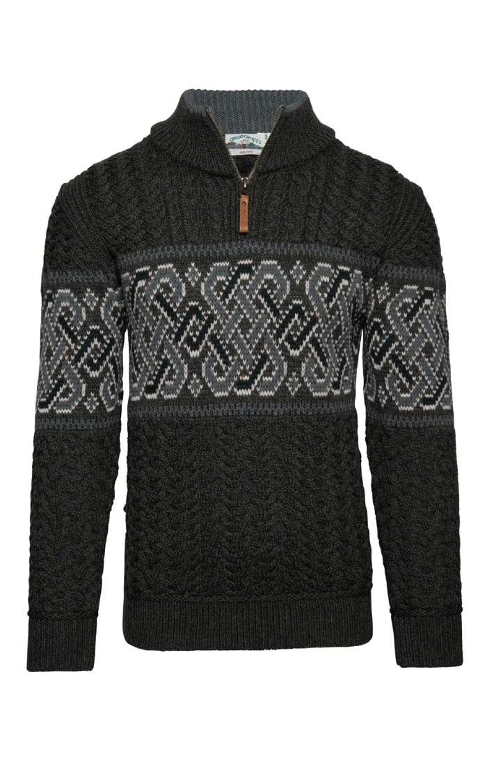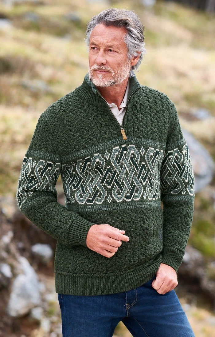 With bold, traditional designs and modern styling, this Celtic Aran T-zip is a stand-out piece in any wardrobe. Featuring traditional Aran stitching and a contrasting pattern across the chest and arms, this T-zip benefits from a thick, high ribbed collar as well as ribbed cuffs and hems for added comfort.