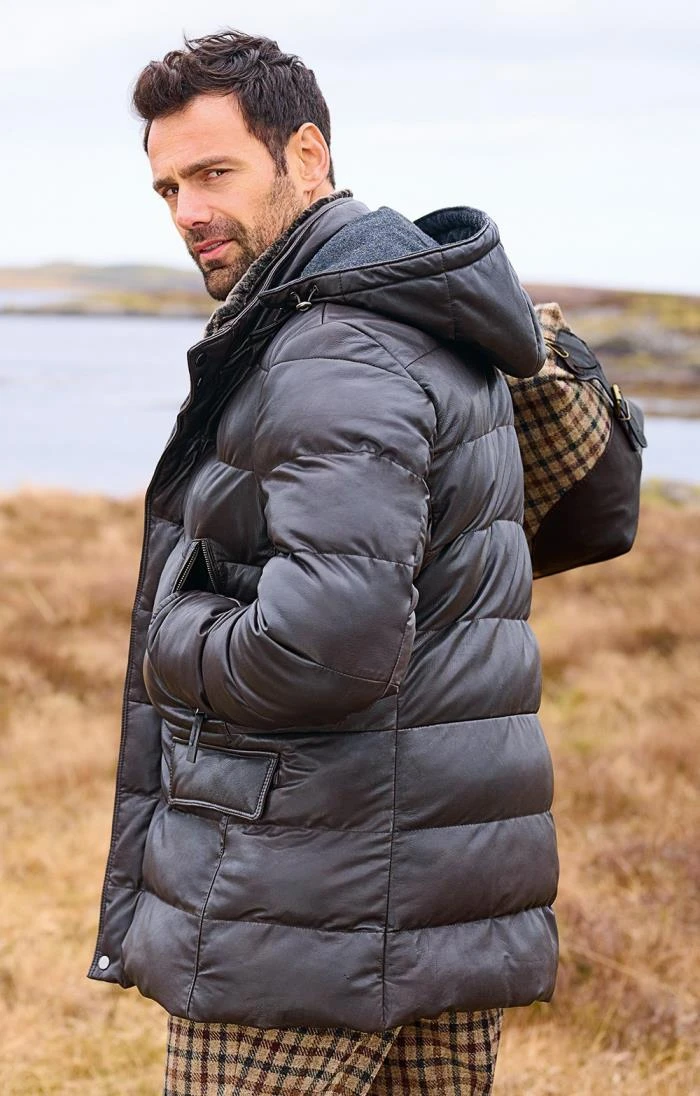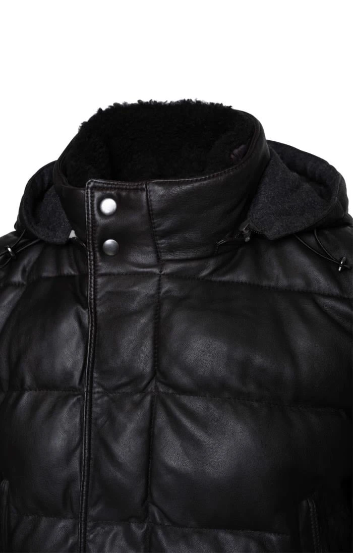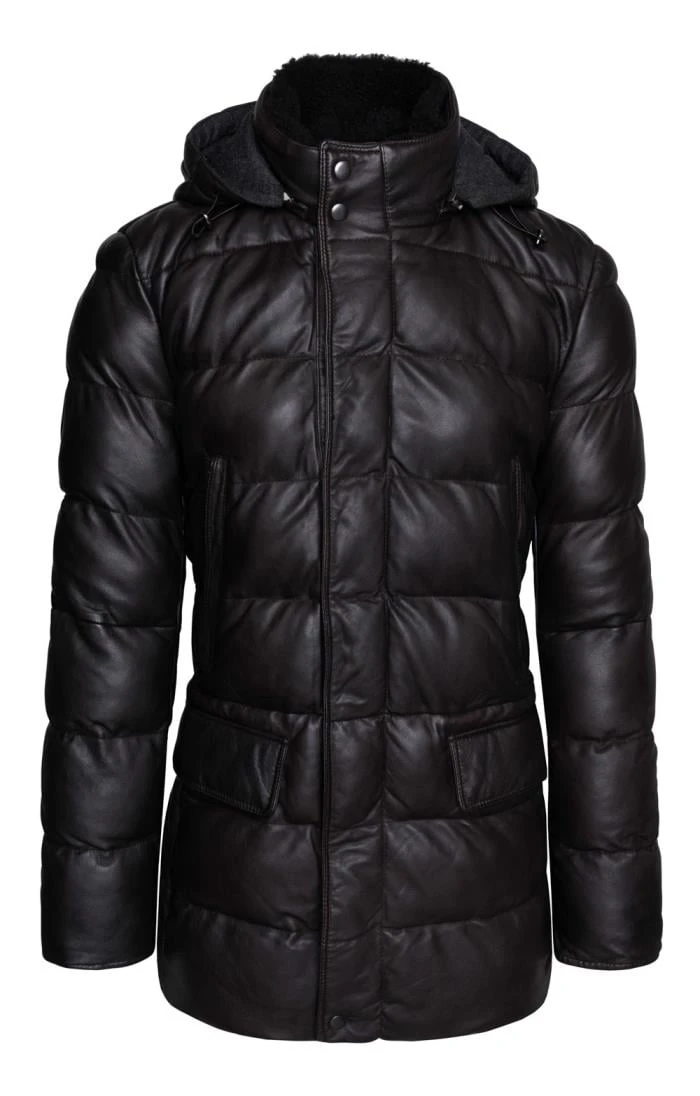 Horizontal baffles and a faux fur collar seal in warmth in our lamb leather and sheepskin quilted parka, with vertical zipped side pockets, flapped front pockets, stud front fastening and adjustable hood providing practicality while making a striking style statement in this handsome new season design.