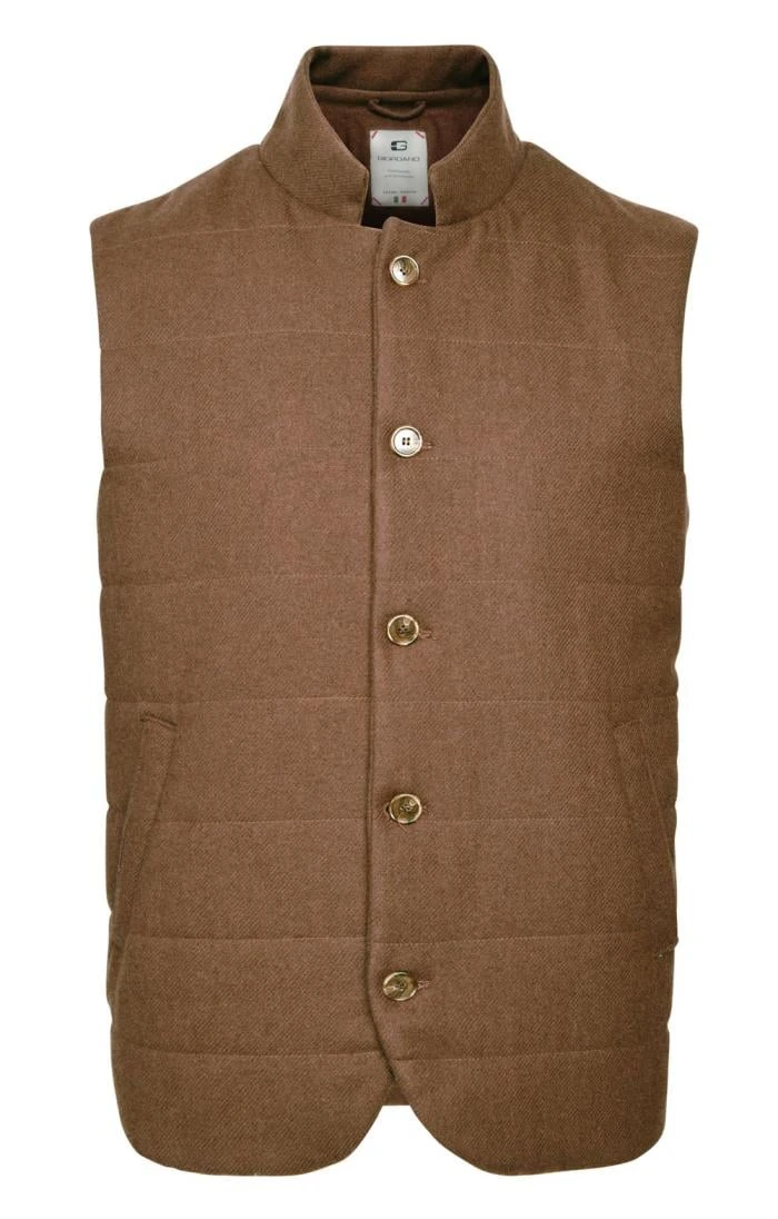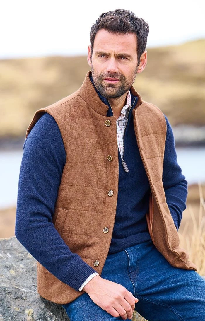 Layer up with distinction this season in this dapper and distinguished wool rich padded waistcoat. Impeccably cut to create a country look whilst retaining an element of tailored elegance, this handsome piece slips easily over casual shirts and knitwear for a co-ordinated effect that warms without bulking. Gently padded in horizontal panels, the button fastening leads to a contemporary mandarin collar that sits neatly whatever you wear it with. Angled handwarmer pockets add further practicality into the mix.